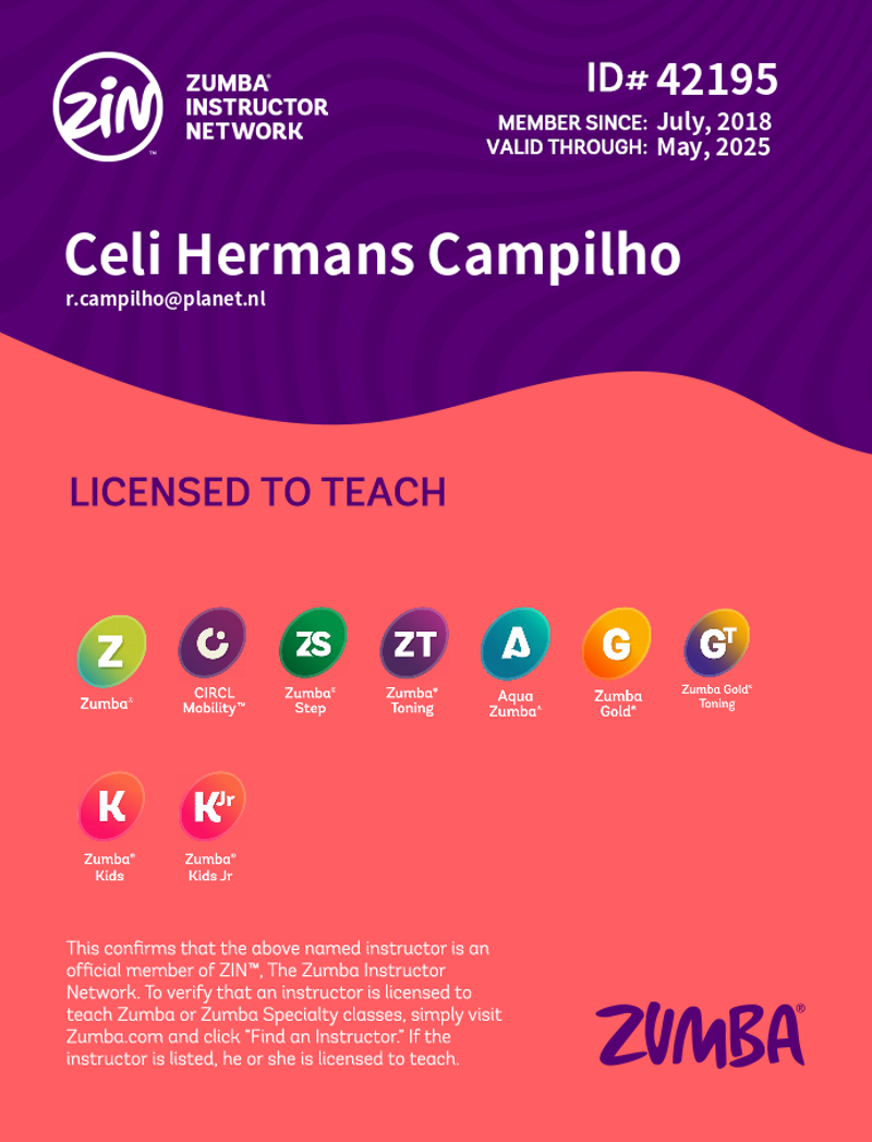 Toevallig ben ik in de sportbranche beland en ik heb het nooit meer losgelaten. Van het Cognitieve Onderwijs naar het Lichamelijk Onderwijs. Ik ben erachter gekomen dat ze allebei samen lopen… Ik begon als Aerobics instructrice en heel gauw heb ik de ene opleiding na de andere gevolgd: Aerobics, Step, Bodyshape, Fitness en tenslotte Medical Fitness! Mijn eerste contact met Zumba was in 2009 toen Beto Perez (de bedenker van Zumba) naar Nederland kwam. Het was waanzinnig en sindsdien heb ik de Zumba wereld niet verlaten. Ik heb me veel gespecialiseerd. Na Zumba Fitness 1 met Beto, volgden de Zumba Fitness 2 en Zumba Toning (+ gewichten). Later kwamen Zumba Step, Zumba Gold (Senior), Zumba Kids en Aqua Zumba! Inmiddels heb ik Strong Nation (HITT) en laatste Circl Mobility erbij gehaald. Als bonus heb ik Zumba Core, Zumba Gluteus, Zumba Brasil, Zumba Caribbean, Zumba India en Zumba Africa gehad. De een nog leuker dan de ander, altijd plezier bij Zumba.